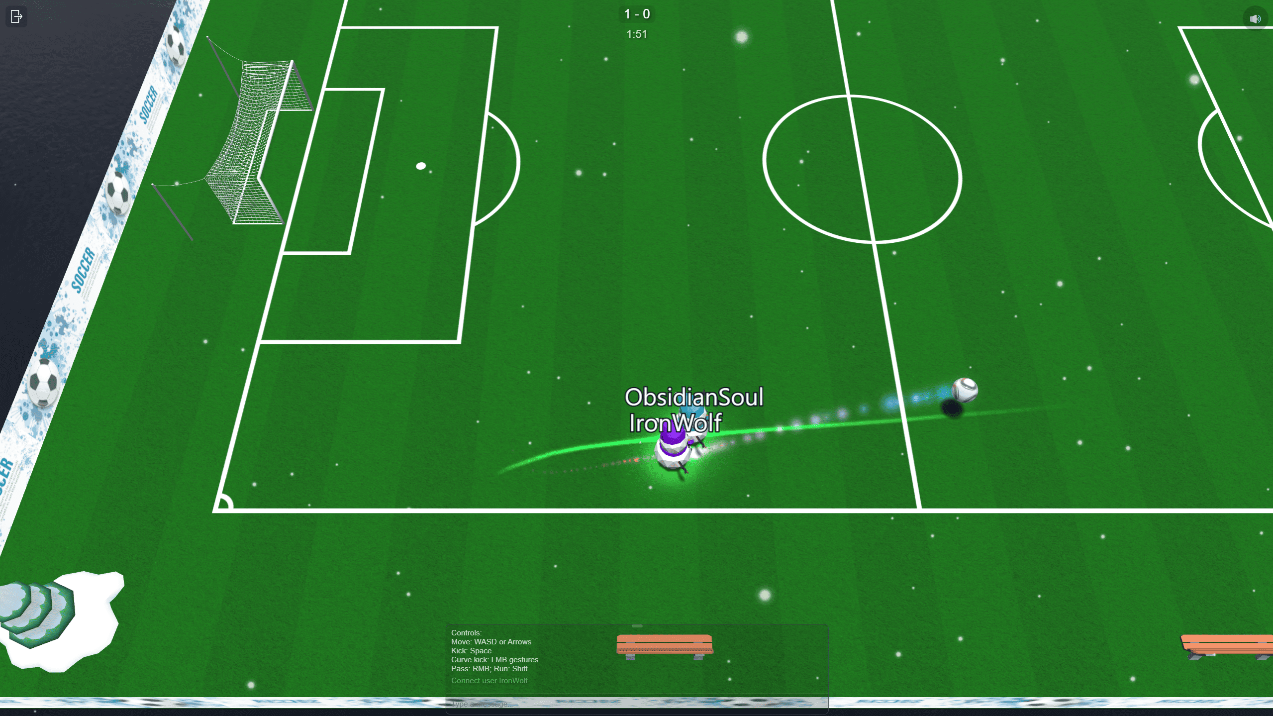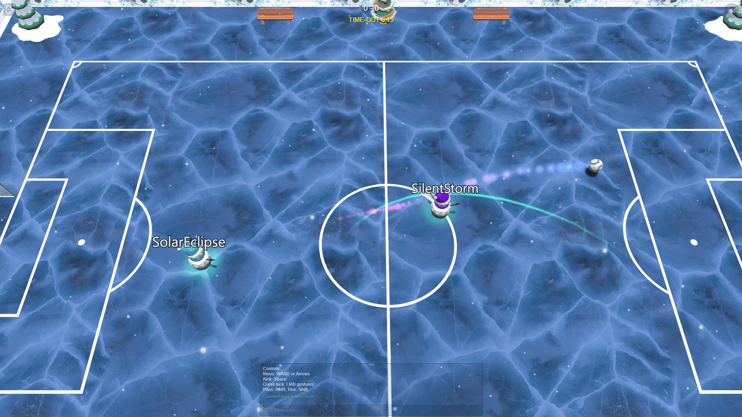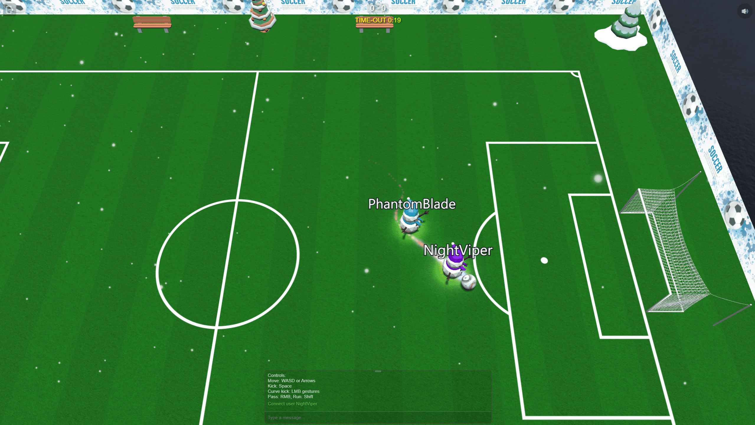 Soccer Online is a multiplayer football game. Key Features: Online matches with other players. Ability to choose mode: grass or ice. Realistic ball physics. Winter atmosphere. Built-in chat for player communication. Choose your nickname, score goals, and compete against other players in matches on grass or ice today!
